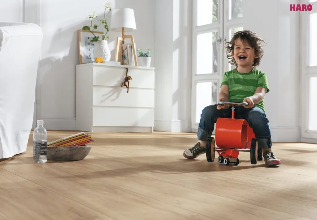 Laminat og vinyl i en høy sliteklasse er meget godt egnet i et aktivt hjem med småbarn og dyr, eller i offentlig næringslokaler.